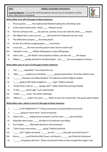 Ks2 Ks3 Homophones Grammar Spag Worksheet Of Off Your You Re Were Where We Re Teaching Resources