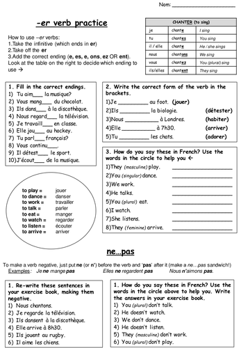 Ks3 French Er Verbs Regular Worksheet Teaching Resources